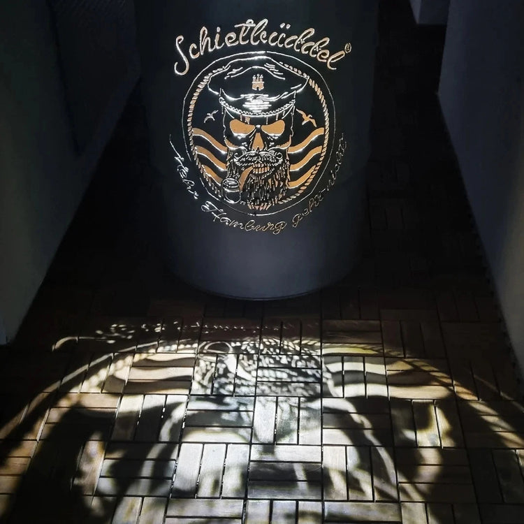 Ja, das Schietbüddel-Logo ist hochwertig ausgeschnitten – bei Feuer entsteht ein einzigartiges Lichtspiel.